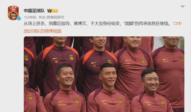 中国足球队写道:“从场上拼杀,到幕后指导,黄博文、于大宝身份转变,“国脚”的传承依然在继续。”